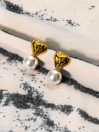 Modern heart pearl earrings: Sculpted gold hearts with luminous pearl drops, chic and hypoallergenic.