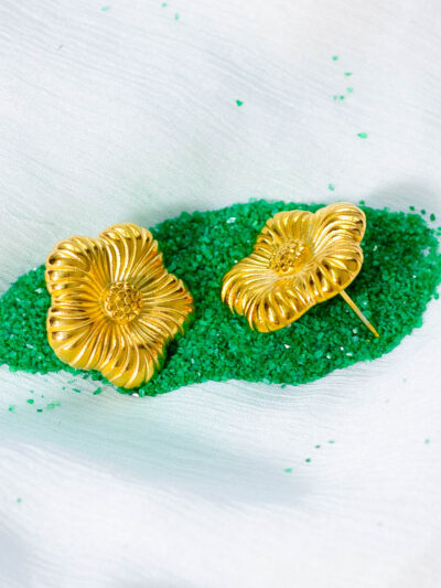 Sculptural flower stud earrings. Gold-plated, textured design. Bold statement style.