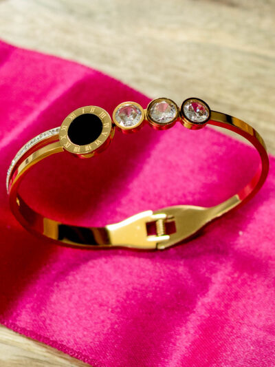₹299.00Description of the Product: This beautifully crafted gold bangle features intricate floral engravings accented with shimmering stones, adding a touch of grace and sophistication. The scalloped edges enhance its refined design, making it a standout piece for any jewelry collection. Features of the Product: Premium gold finish with floral engravings…