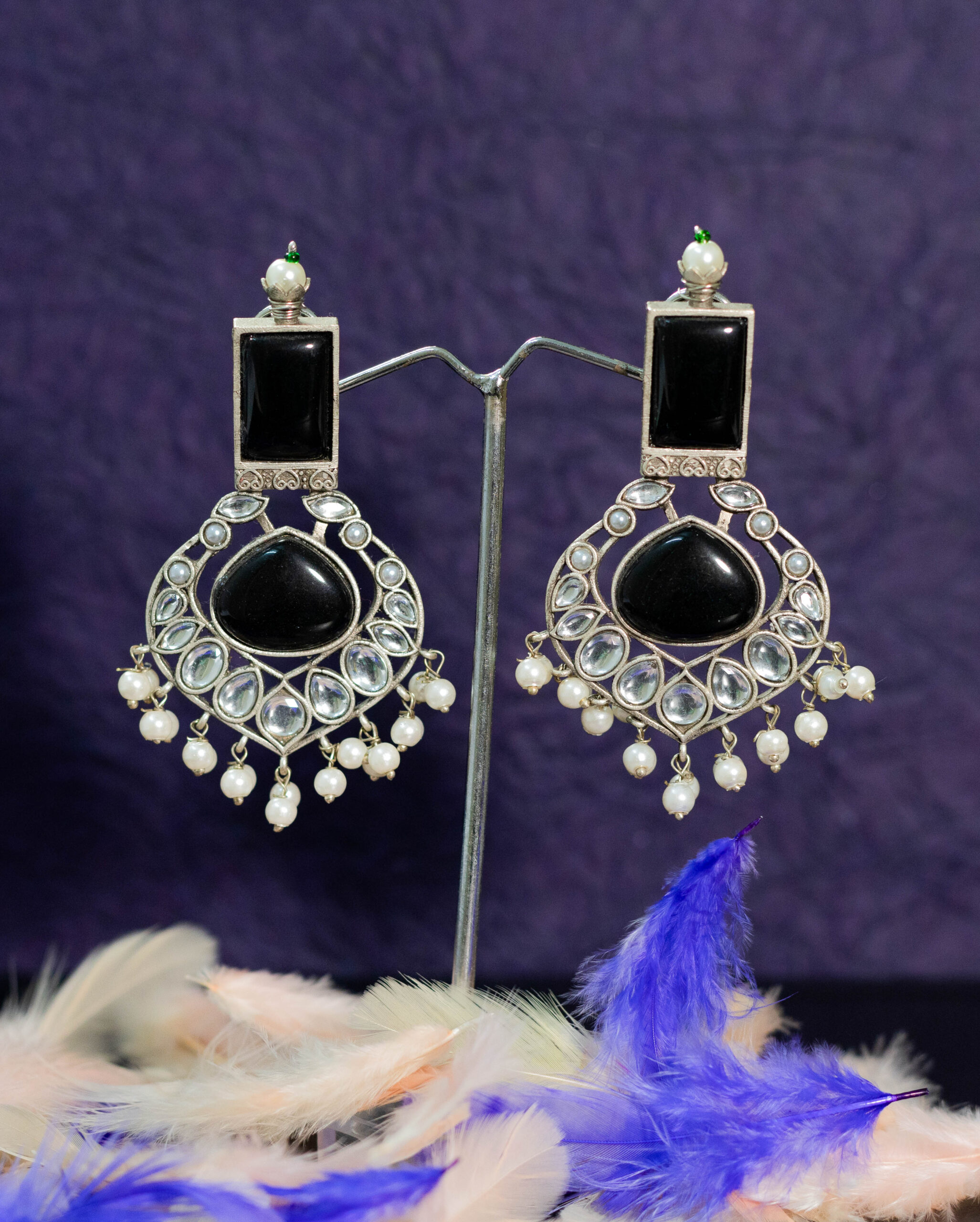 These Black Onyx & Pearl Drop Earrings feature polished black onyx stones in a classic drop design, accented with delicate simulated pearl embellishments. The oxidized silver finish adds a touch of vintage sophistication. Perfect for adding a touch of timeless glamour to any occasion. Lightweight and comfortable for all-day wear.