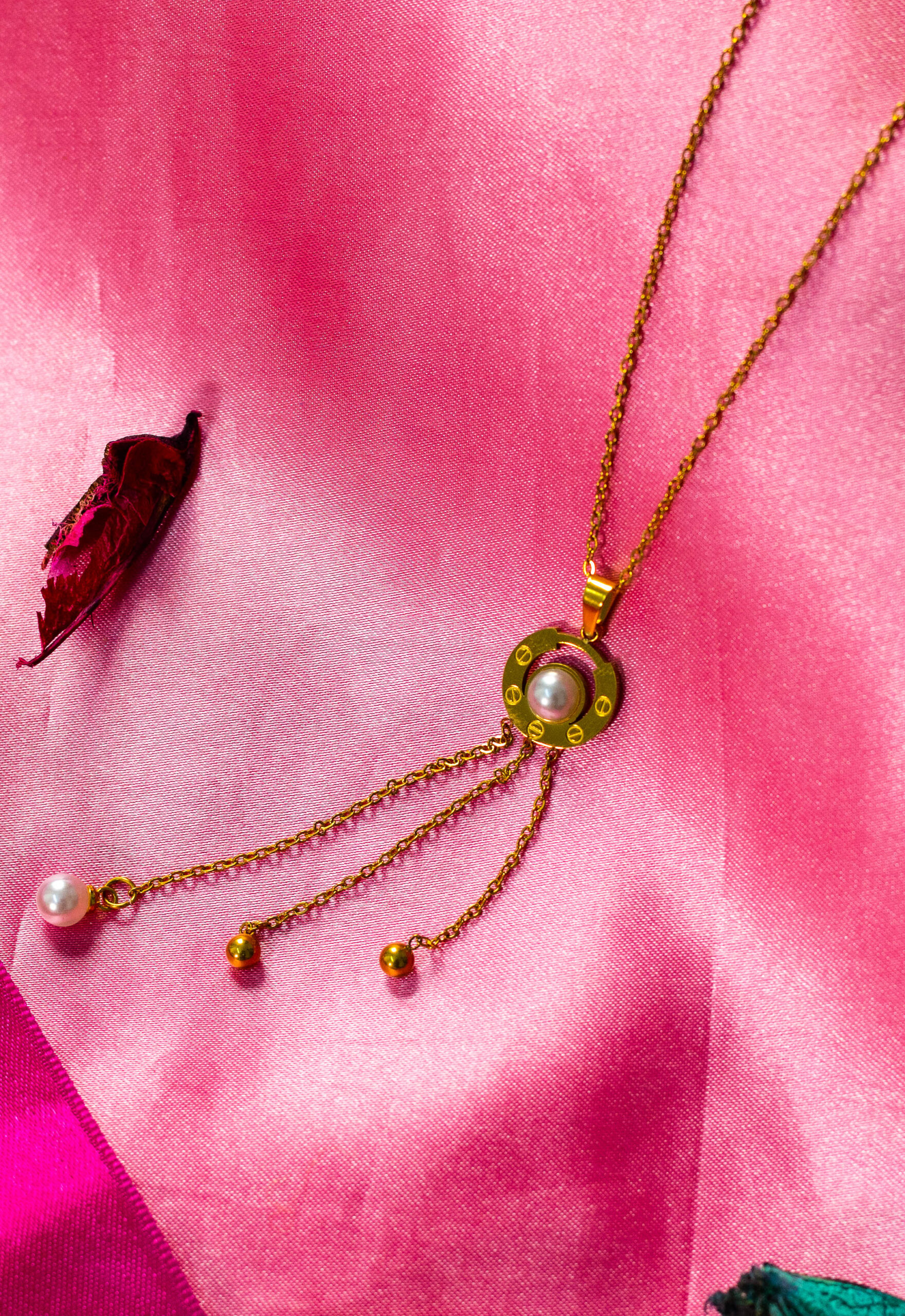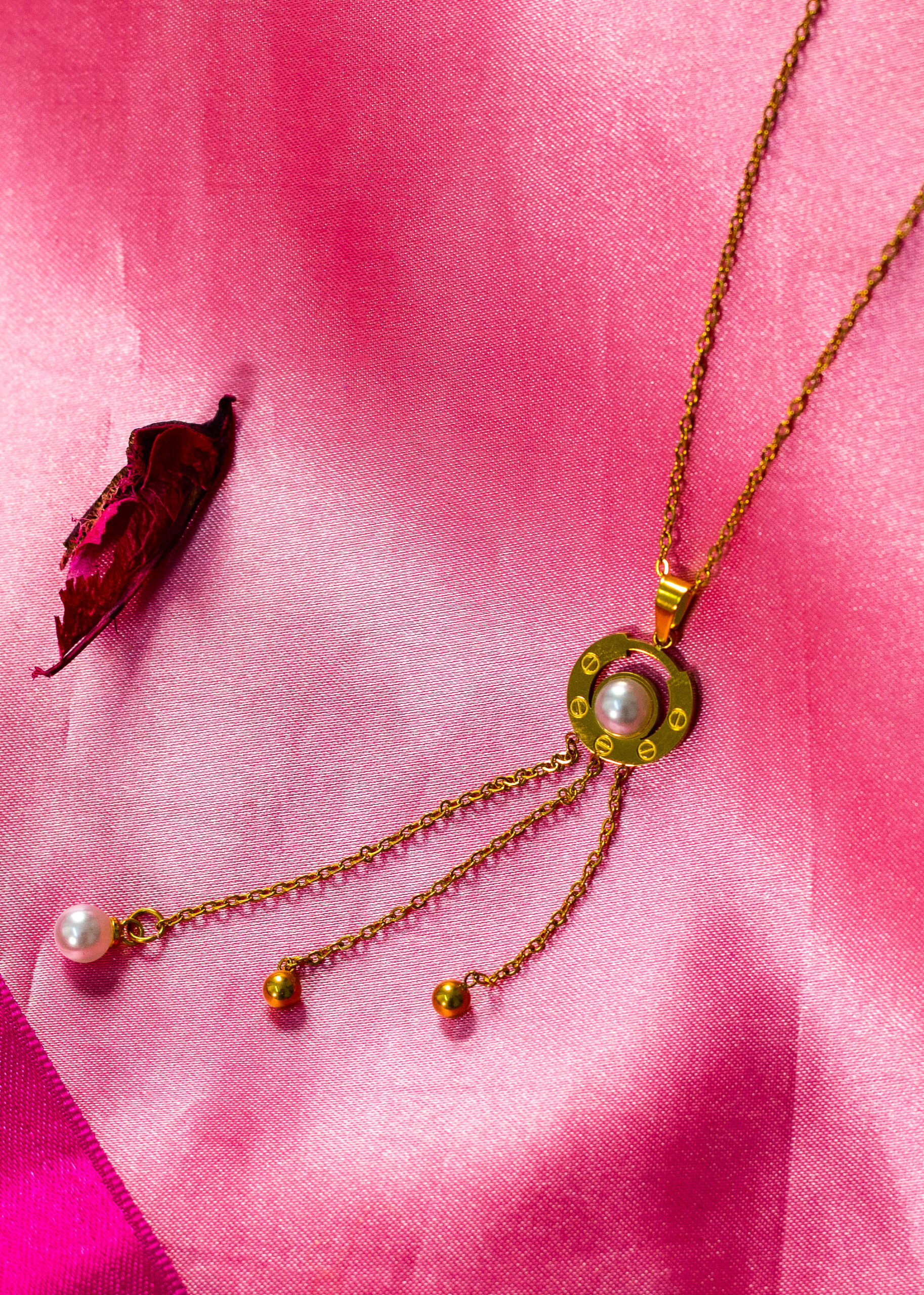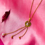 A delicate and elegant necklace featuring a circular pendant with a central pearl, reminiscent of Cartier designs. Dangling chains with additional pearls and beads add movement and sophistication.