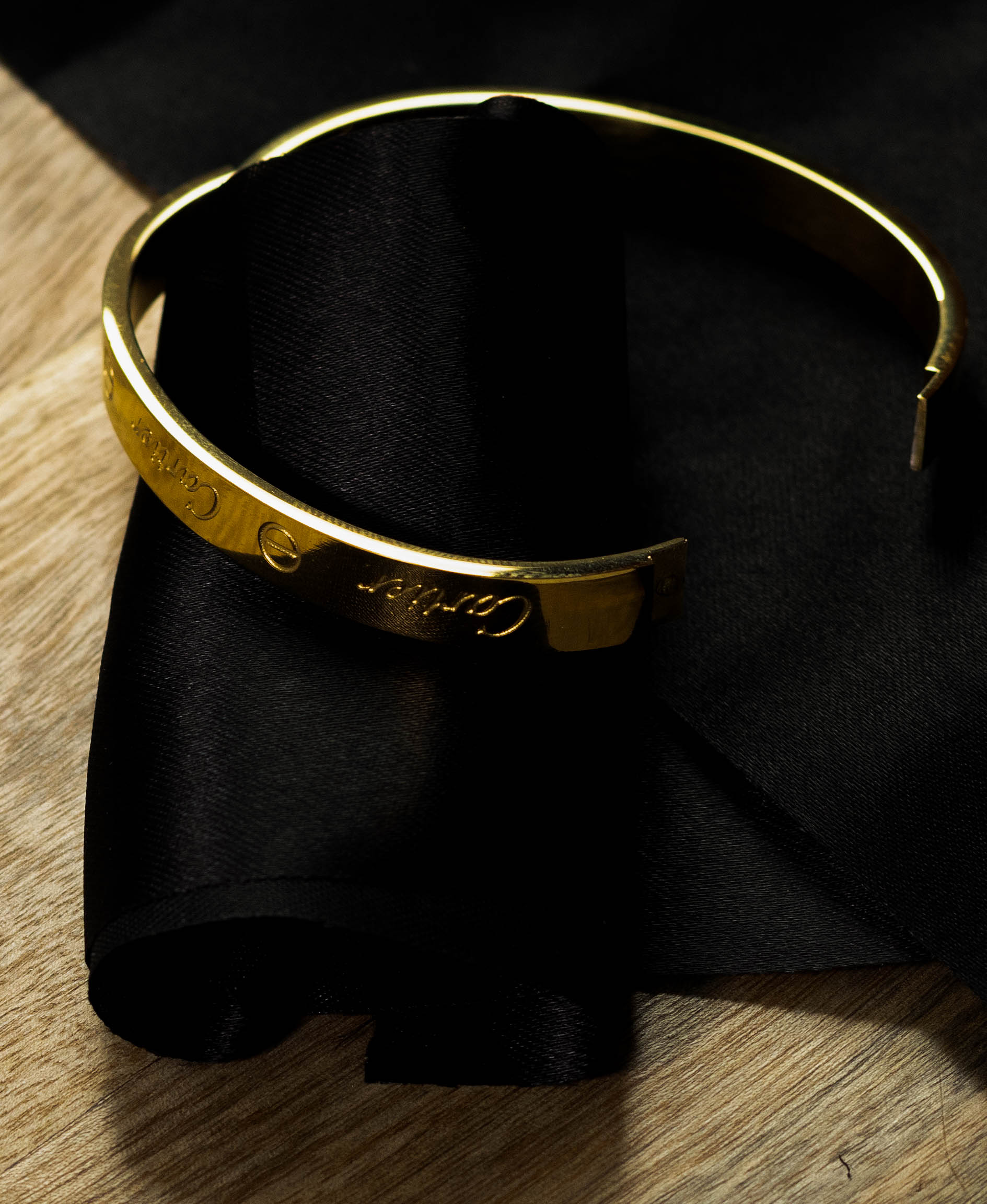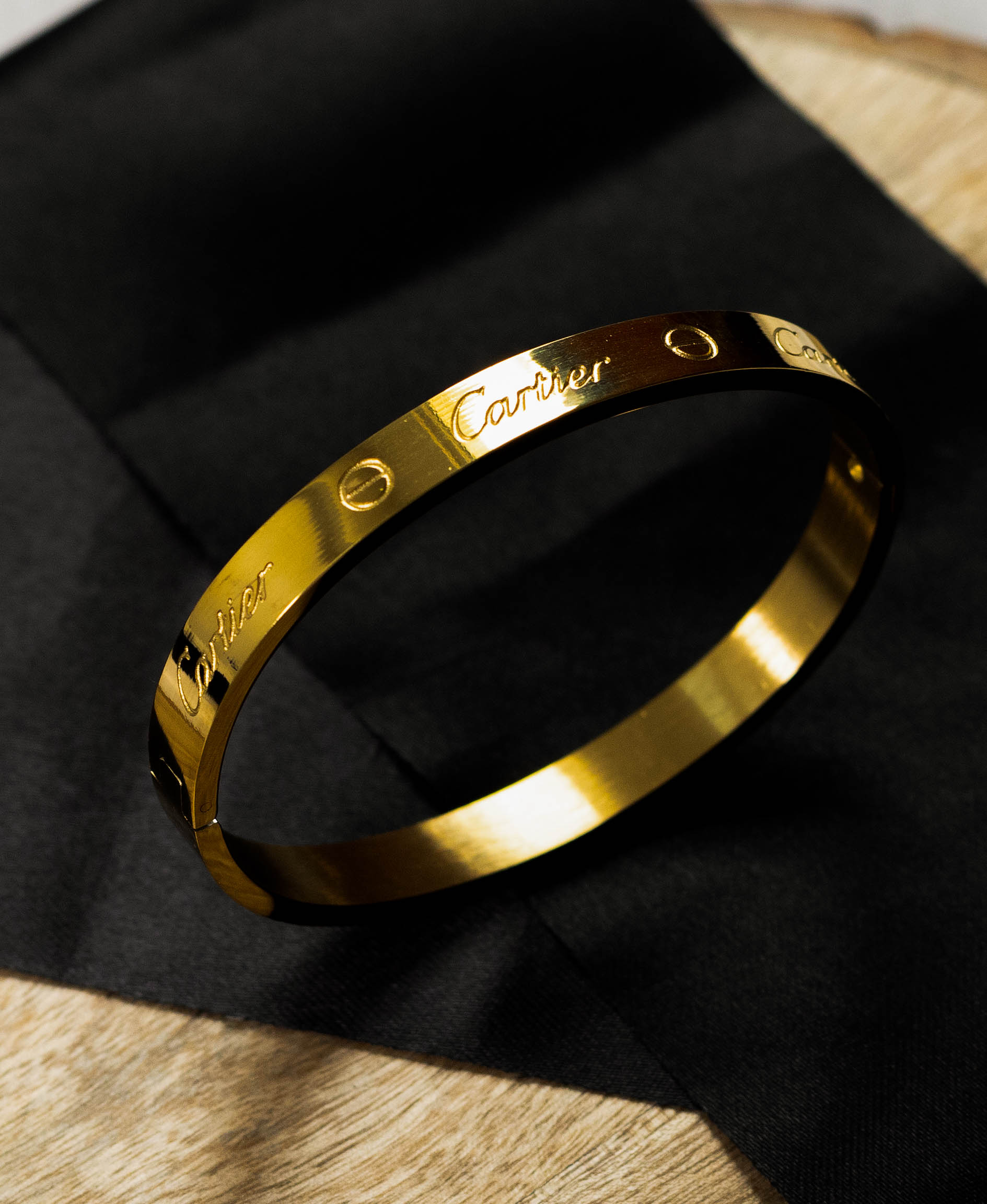 This elegant bangle bracelet features a sleek, gold-tone design with the iconic Cartier LOVE bracelet motif, including screw details and the brand name subtly engraved. Its classic and sophisticated style adds a touch of timeless glamour to any outfit.