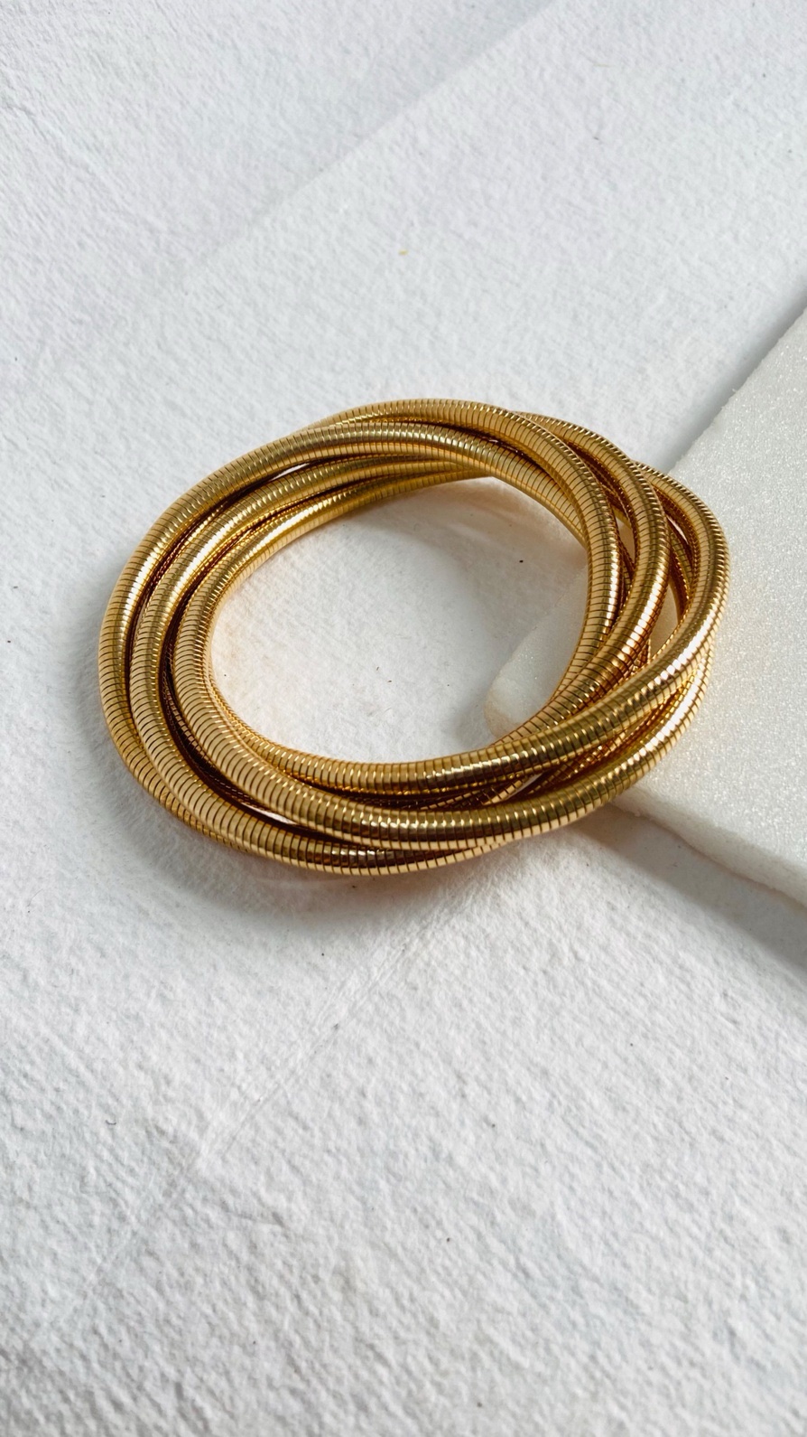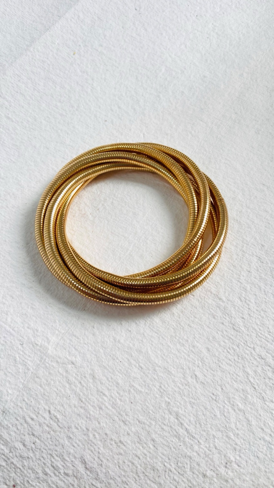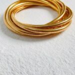 This set of elegant gold coil bangles features a flexible and smooth snake-like texture, making them a trendy yet timeless accessory. The interwoven design creates a stacked effect, perfect for adding a touch of sophistication to any outfit.
