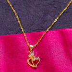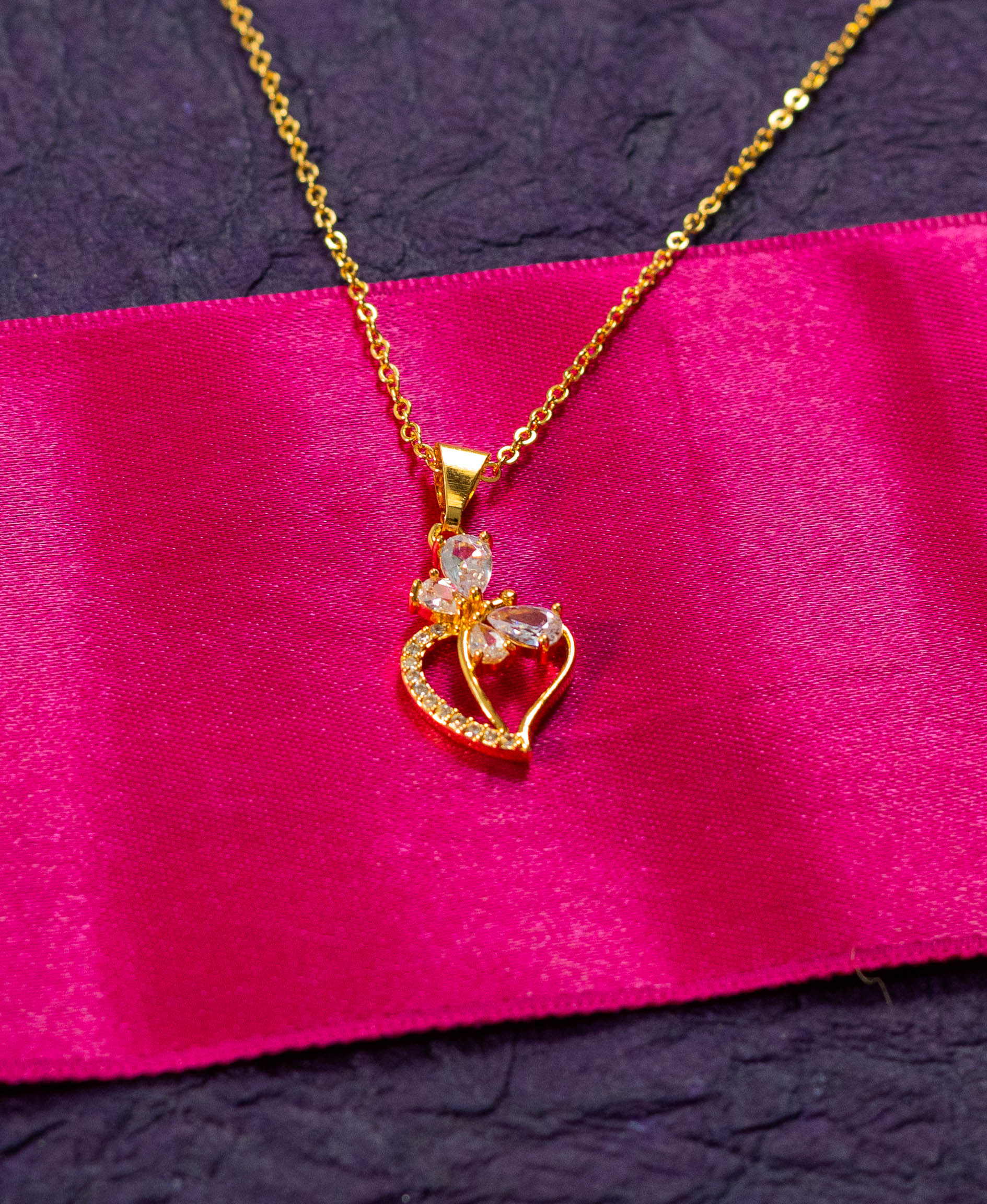 This charming necklace features a delicate heart pendant with a unique double outline design. A sparkling crystal butterfly rests gracefully within the heart, adding a touch of whimsy and elegance. The thin gold-toned chain complements the pendant’s dainty design.
