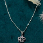 This delicate necklace features a charming rose-shaped pendant encrusted with sparkling crystals. The intricate floral design adds a touch of feminine elegance, making it a perfect accessory for everyday wear and special occasions. The thin chain complements the pendant’s dainty design.