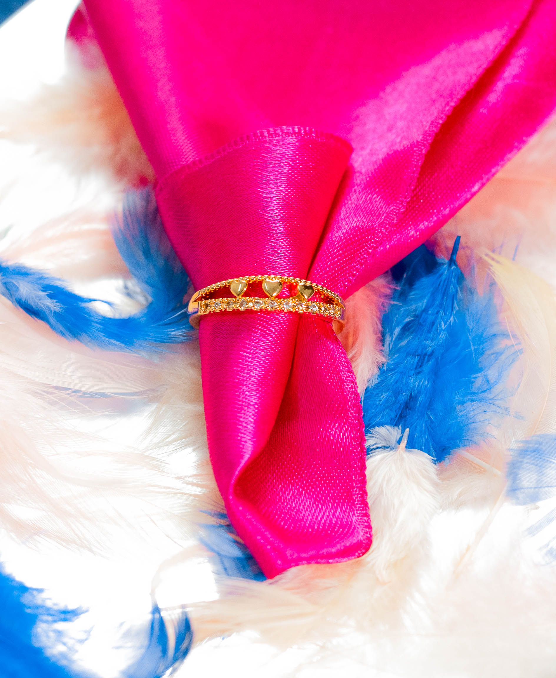 This Dainty Heart & Crystal Stacking Ring features a slim gold band adorned with tiny hearts and sparkling crystals. Its delicate and feminine design is perfect for stacking with other rings or wearing alone for a touch of subtle sweetness. Adjustable sizing ensures a comfortable fit. Hypoallergenic for sensitive skin.