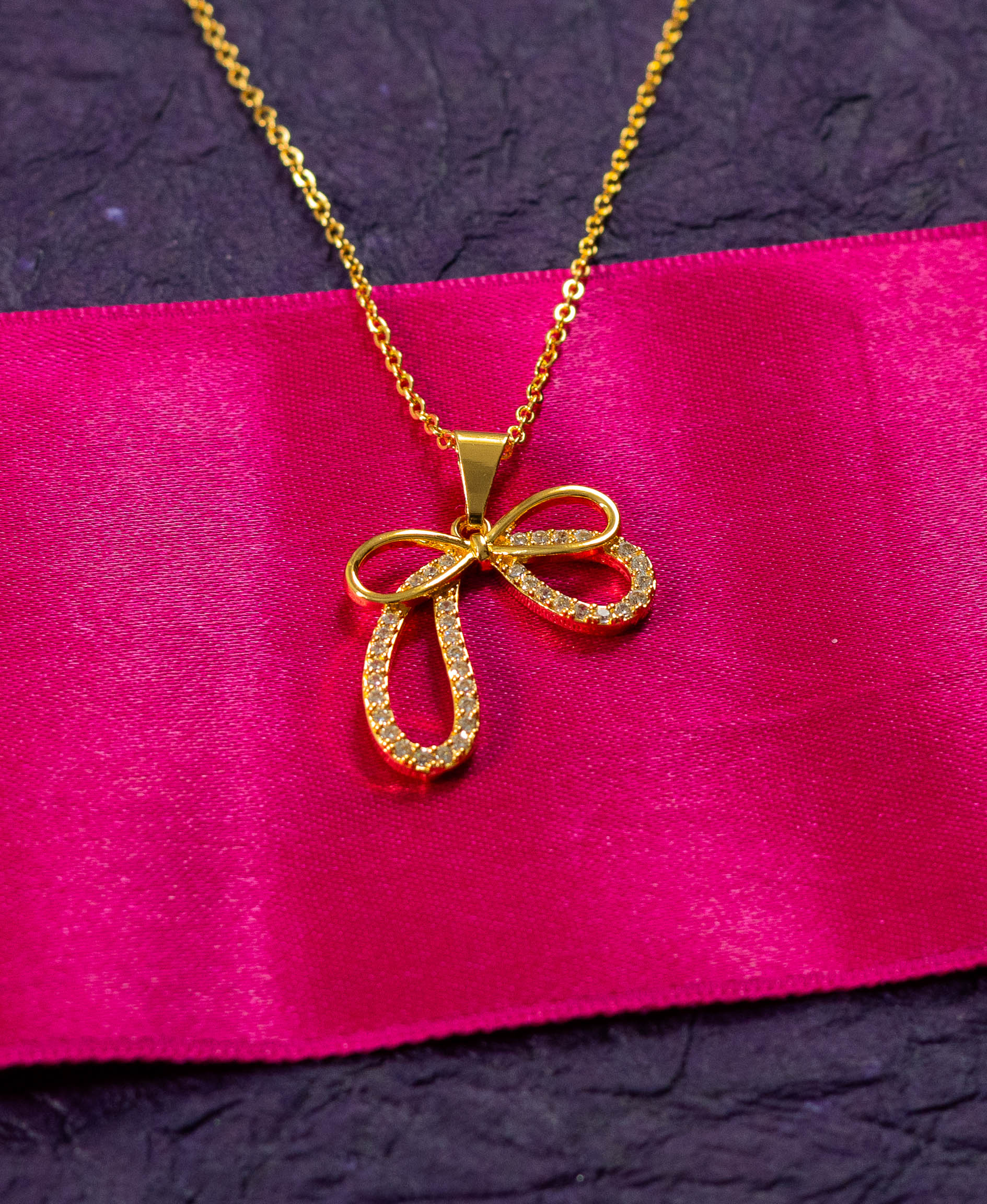 This charming necklace features a delicate bow pendant, partially accented with sparkling crystals. The simple yet elegant design adds a touch of feminine sweetness and subtle sparkle to any outfit, making it perfect for everyday wear. The thin gold-toned chain complements the pendant’s dainty design.
