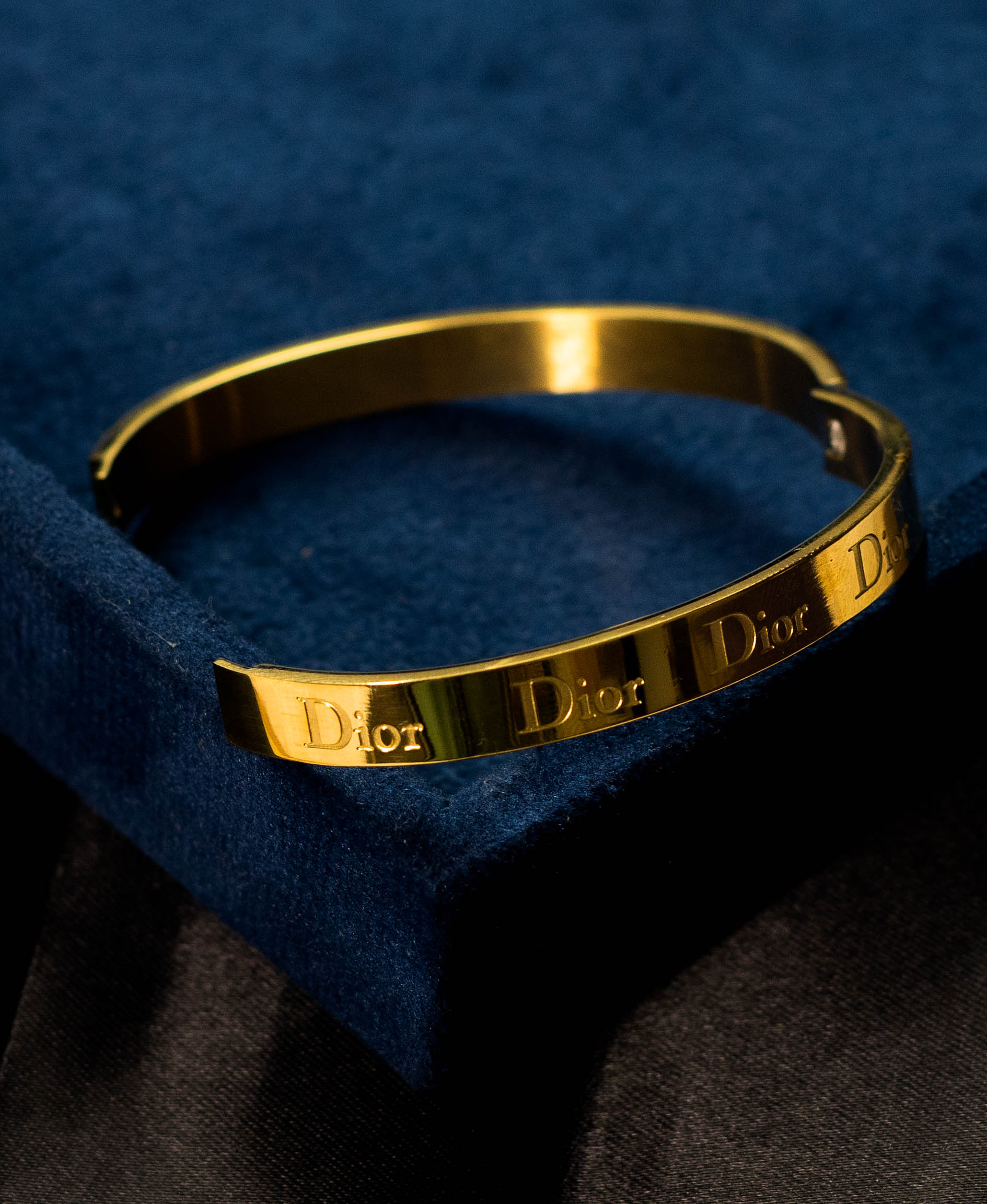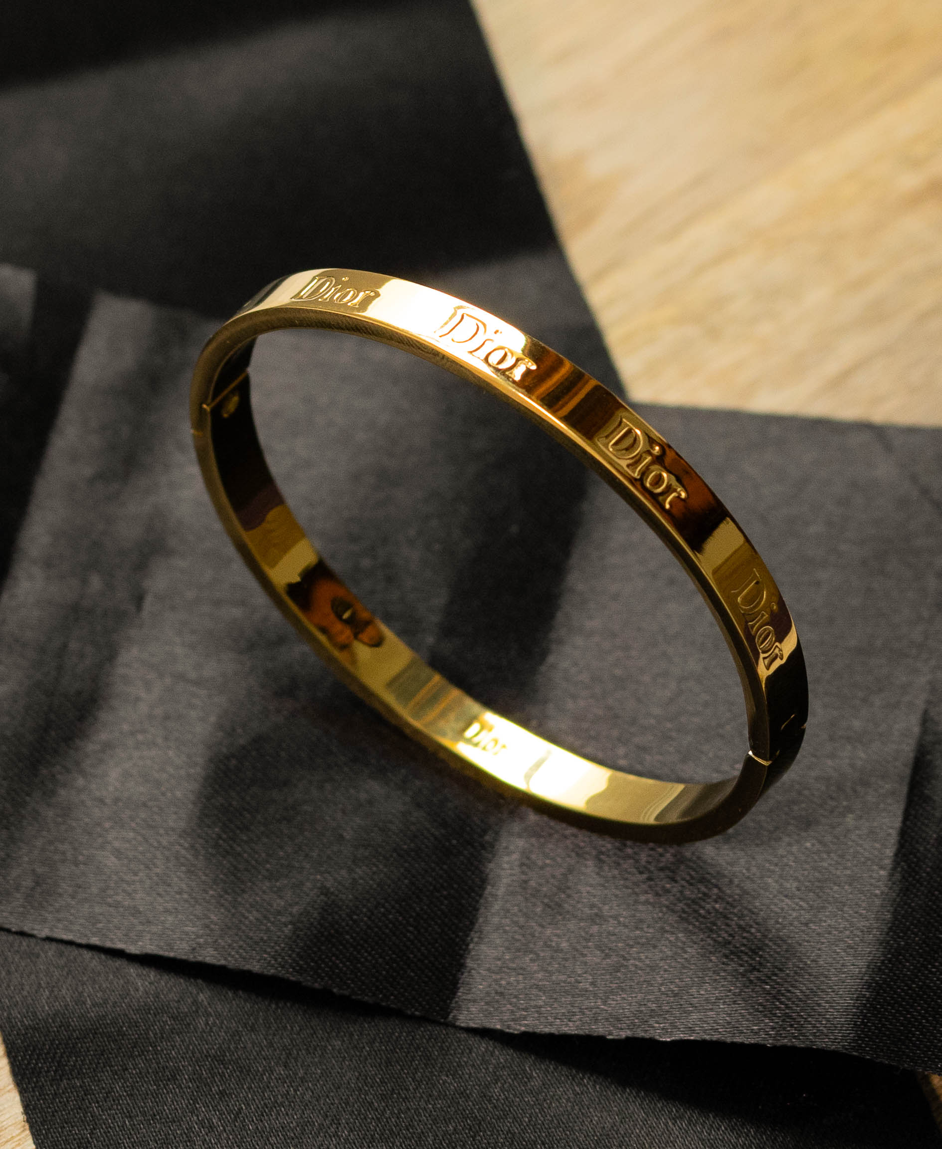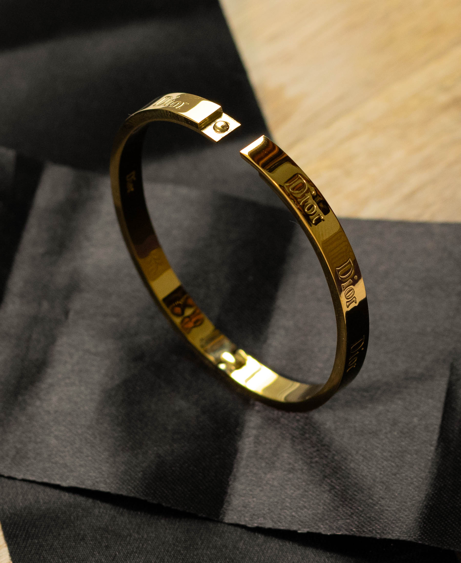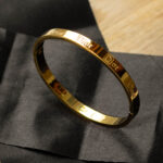 This elegant bangle bracelet features a sleek, gold-tone design with the iconic logo subtly engraved. Its classic and sophisticated style adds a touch of high-fashion glamour to any outfit.