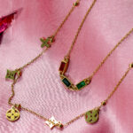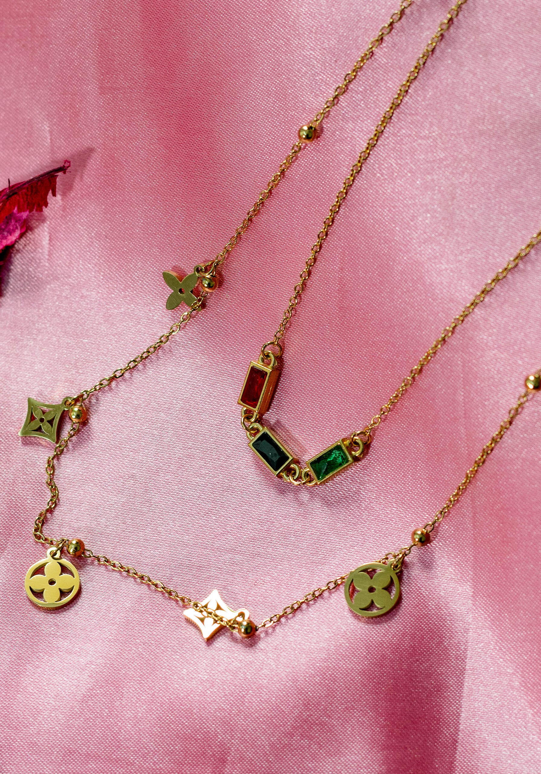his stunning set features three delicately layered gold necklaces. Each necklace showcases unique charms: a clover, a row of vibrant gemstone accents, and a larger clover pendant. Crafted from high-quality alloy and polished to a radiant shine, these necklaces offer a touch of sophistication and versatility for any occasion.