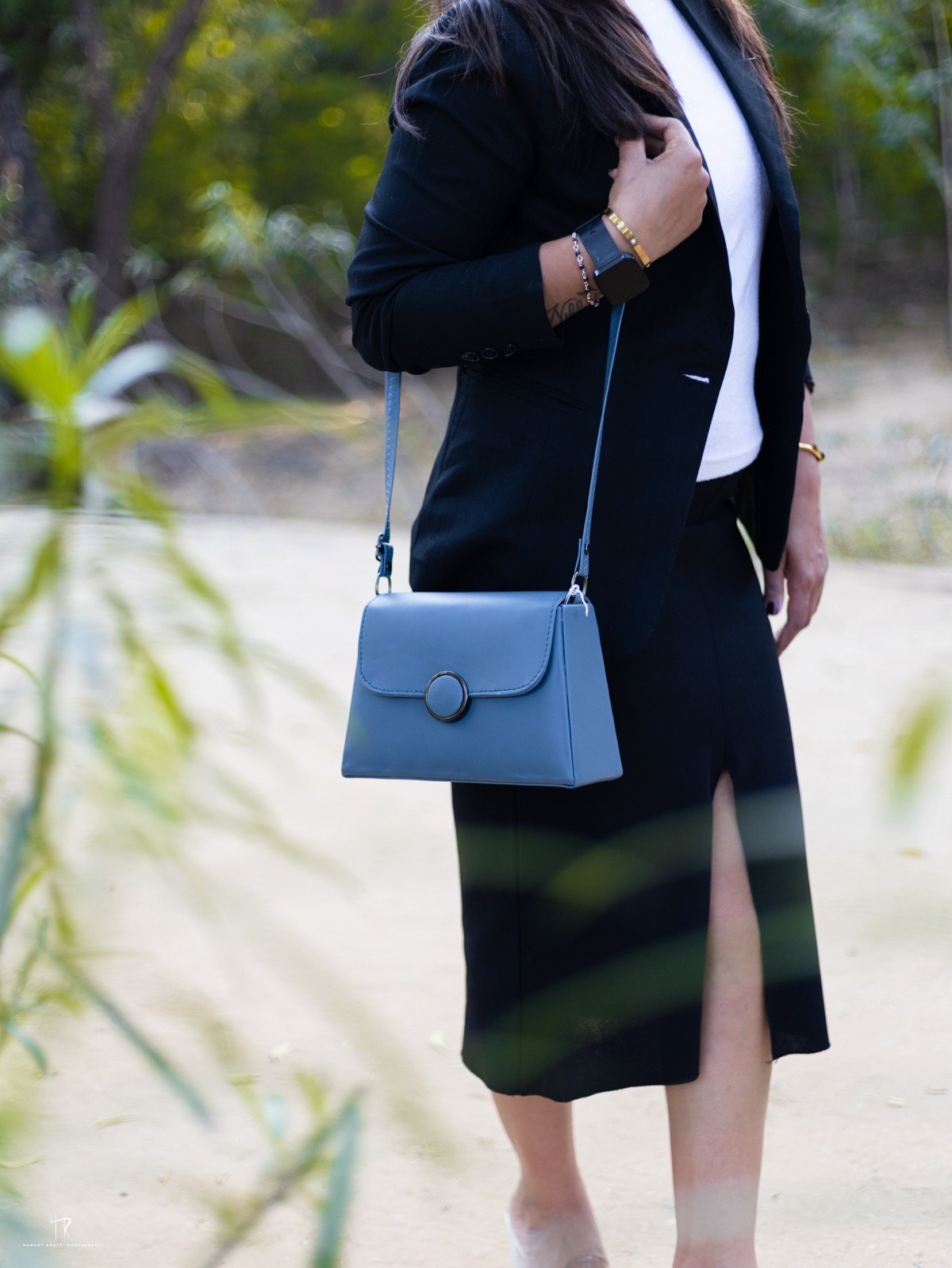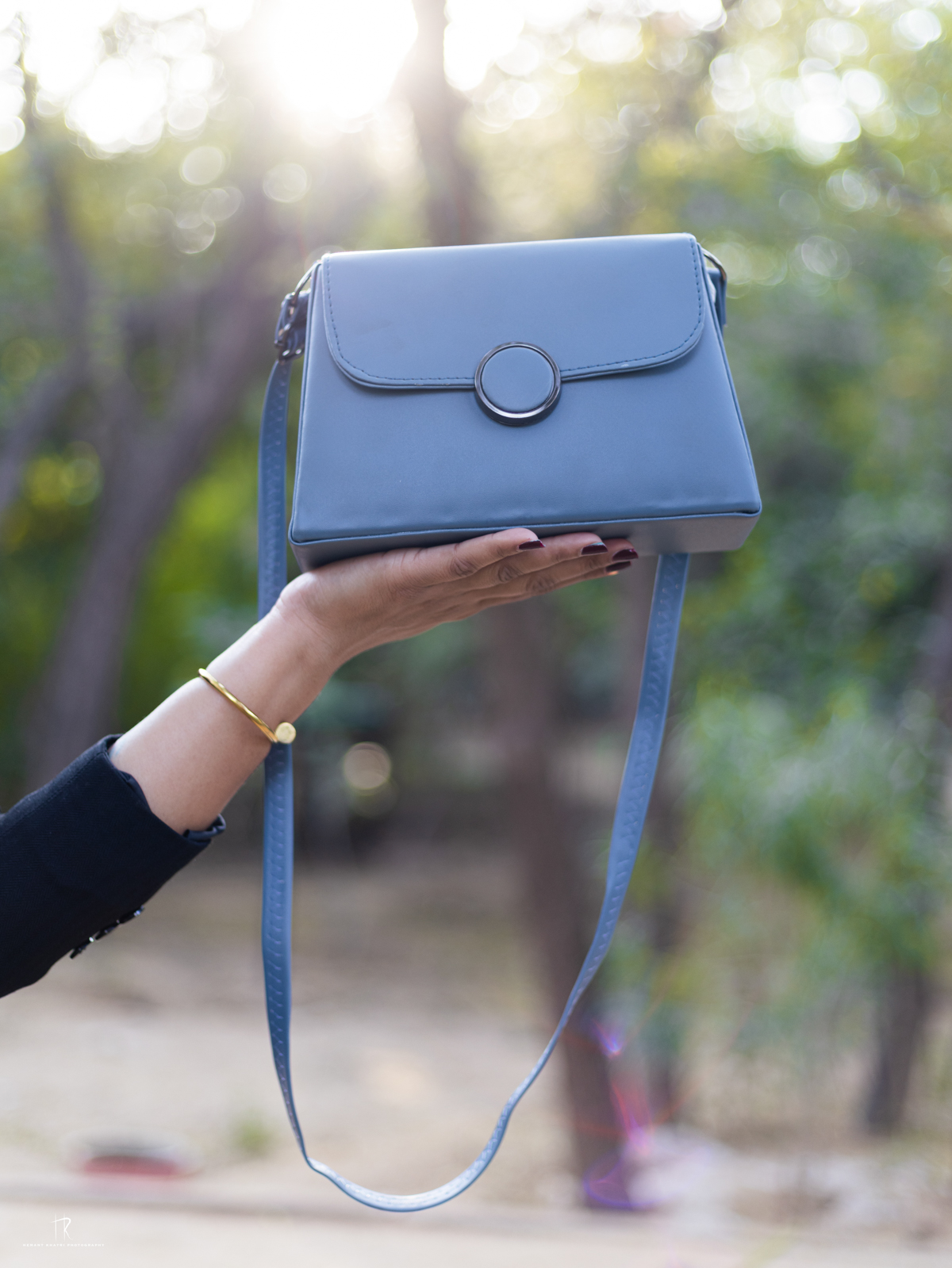 This stylish blue sling bag features a sleek design with a modern round metal closure. Designed for everyday use, it offers a perfect balance of elegance and practicality. The adjustable strap allows for a comfortable crossbody or shoulder wear.