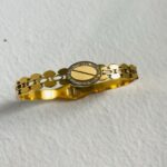This sleek and stylish gold-plated bracelet features a modern geometric pattern with an oval centerpiece adorned with sparkling stones. The delicate craftsmanship and refined finish make it a versatile accessory for both formal and casual occasions.