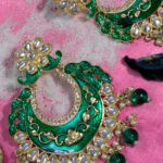 These Green Enamel & Kundan Jhumka Earrings feature a classic jhumka design with rich green enamel, intricate Kundan work, green bead accents, and pearl drops.A colorful and elegant accessory perfect for festive occasions.