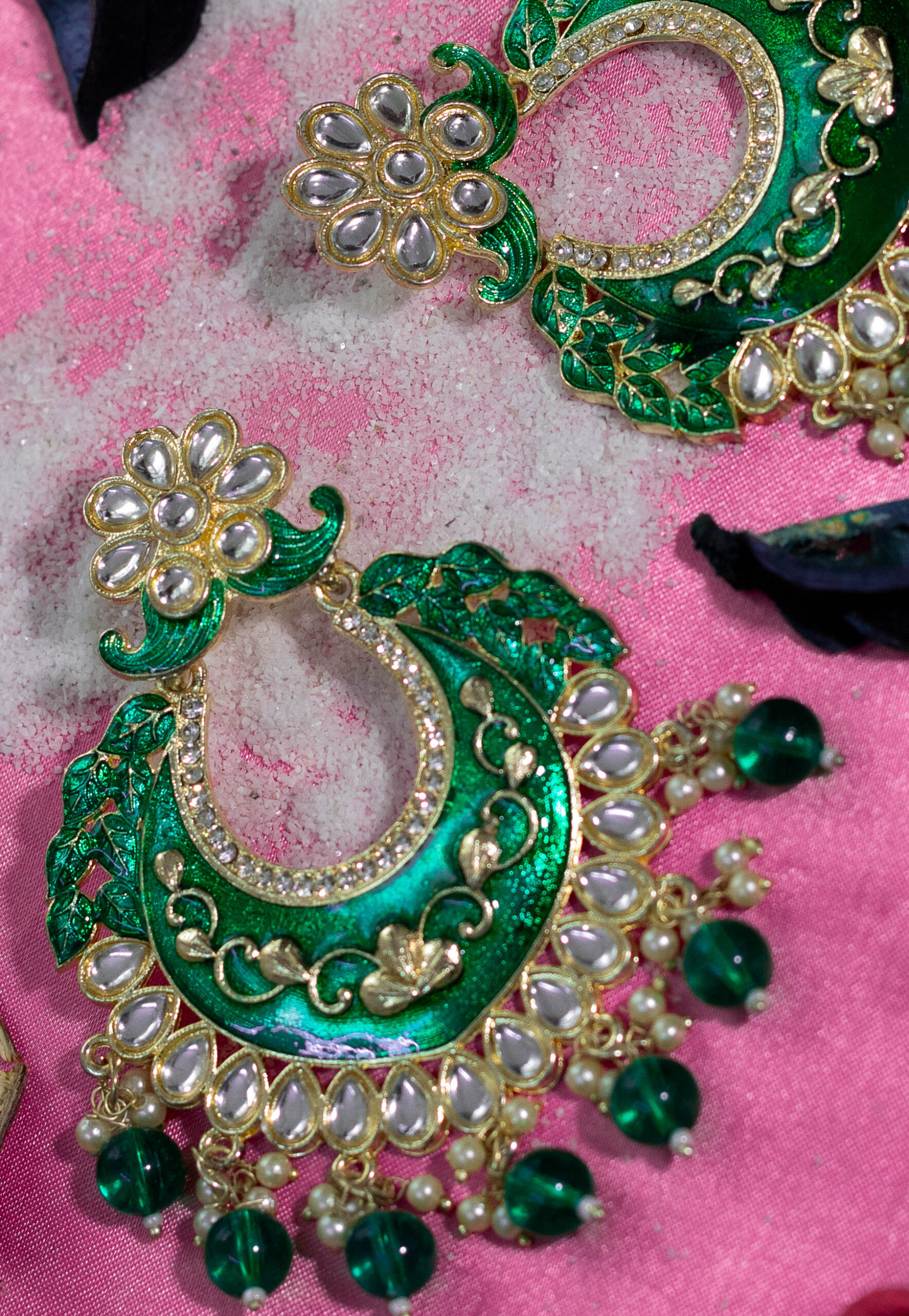 - Material: Alloy, Enamel, Faux Kundan Stones (likely glass or semi-precious stone imitations), Green Glass Beads/Stones, Simulated Pearls