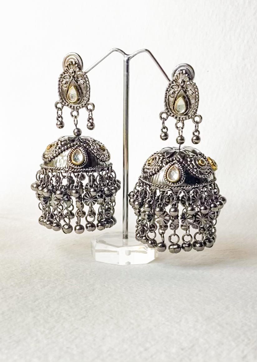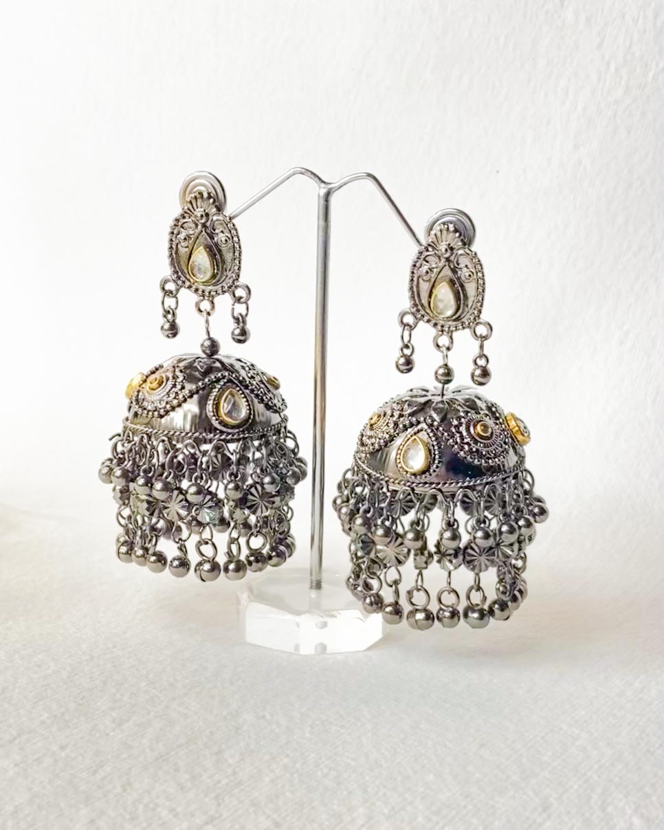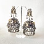 Sanskriti Sparkles Artificial Jewellery’ black jhumka earrings adorned with golden stones exude elegance and sophistication. The contrast of bold black with shimmering gold adds a luxurious, timeless touch to any outfit.