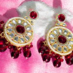 These Kundan & Red Stone Statement Earrings feature a large circular design with red stone centers, intricate Kundan work, and dangling red bead and pearl embellishments. A bold and glamorous accessory perfect for special occasions