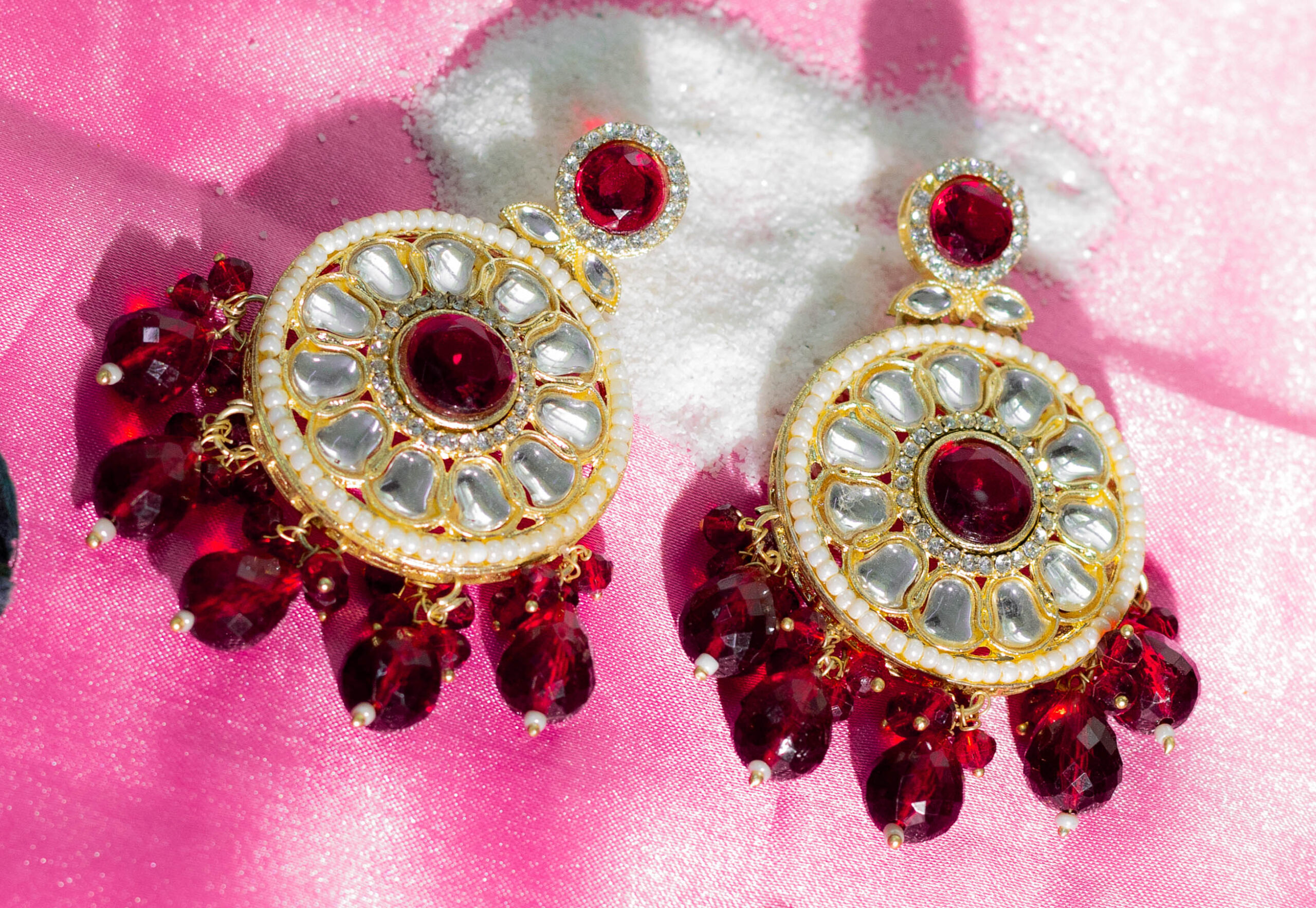 Dramatic Kundan earrings: Gold plated with red stones, white Kundan accents, and pearl drops.