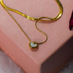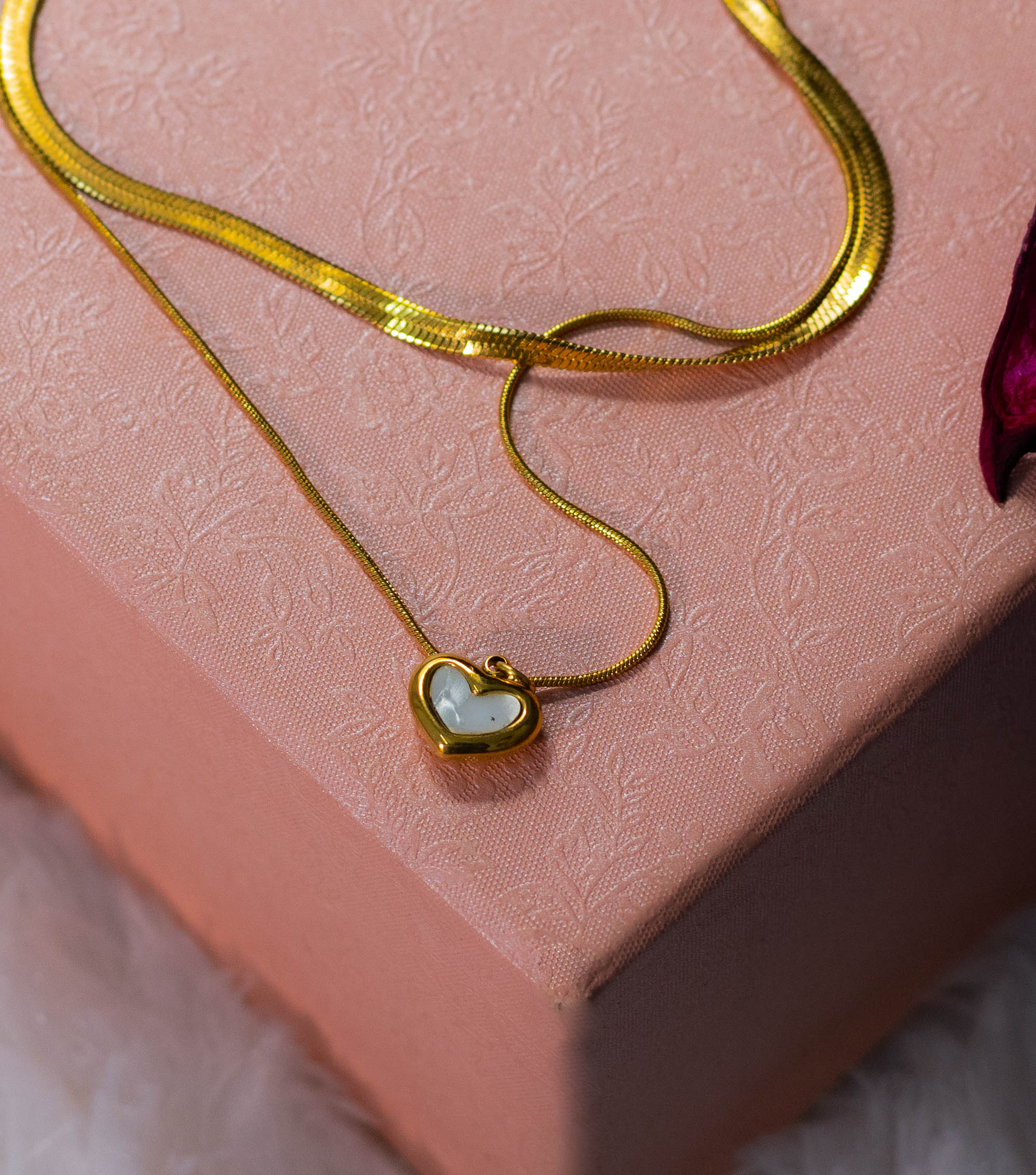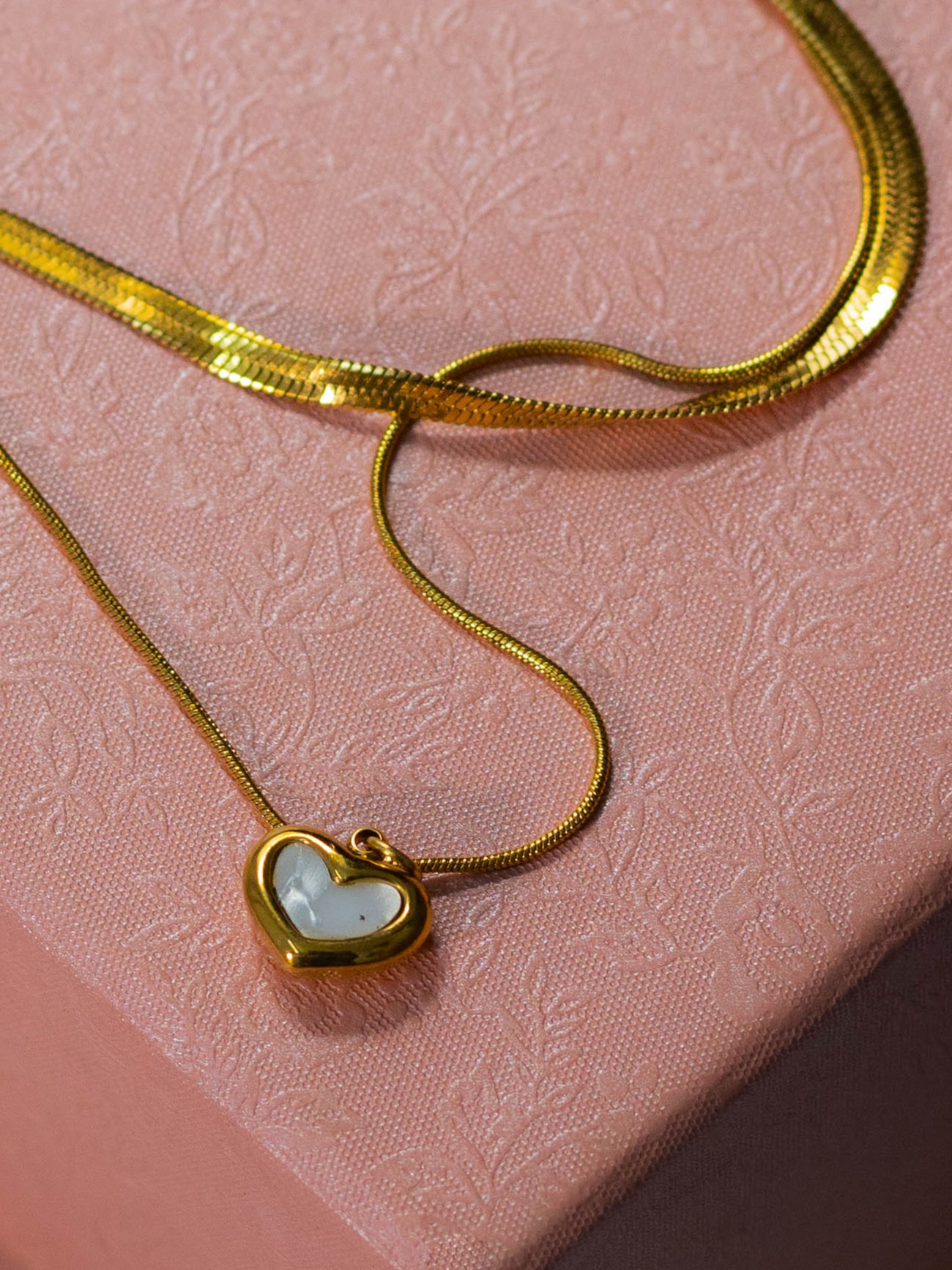 A delicate heart pendant necklace and a chic herringbone chain. Both pieces can be worn together for a layered look.