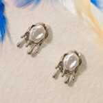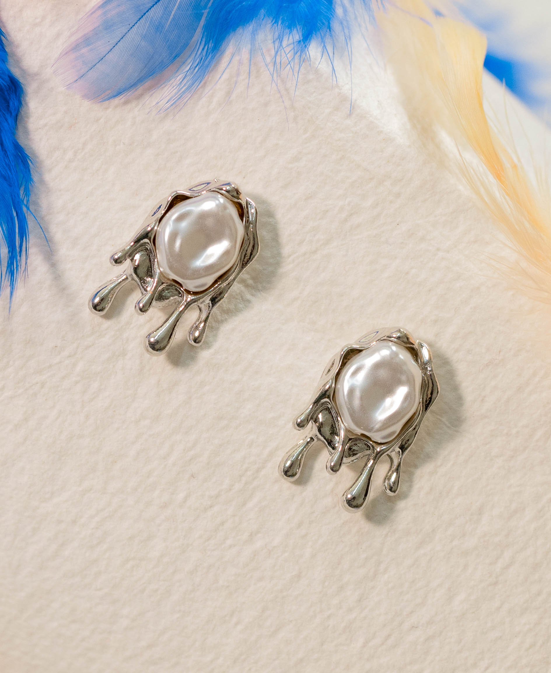 These unique stud earrings feature a contemporary “melted” metal design surrounding a luminous pearl. The organic, abstract shape of the metal contrasts beautifully with the classic pearl, creating a modern and artistic accessory.