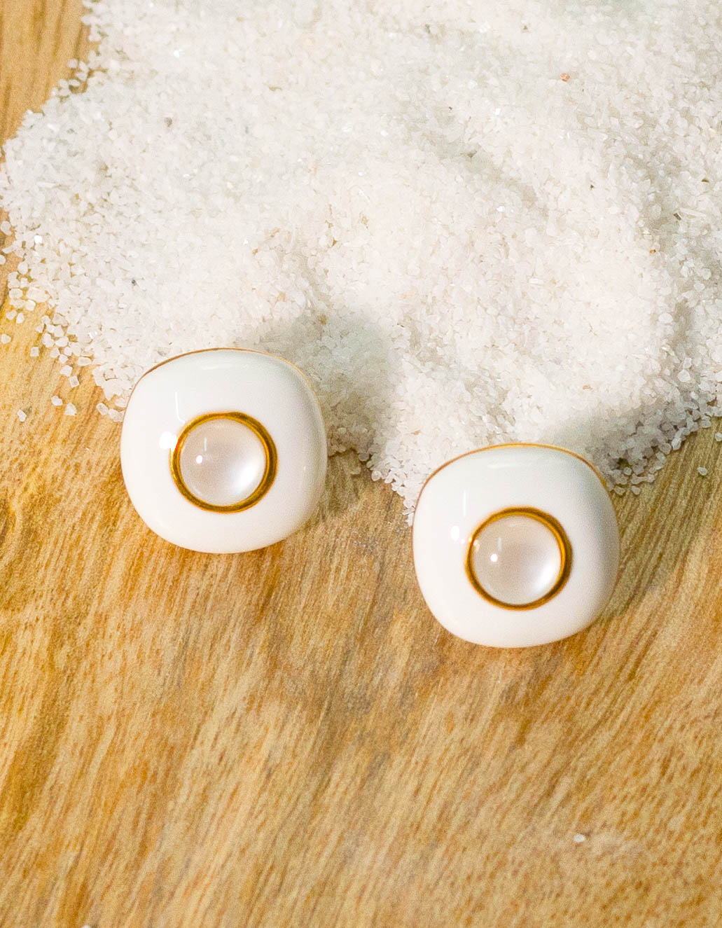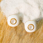 Chic minimalist square stud earrings. White enamel inlay with a delicate crystal accent in a polished gold-plated setting. Modern and versatile, perfect for everyday style. Secure push-back closure.