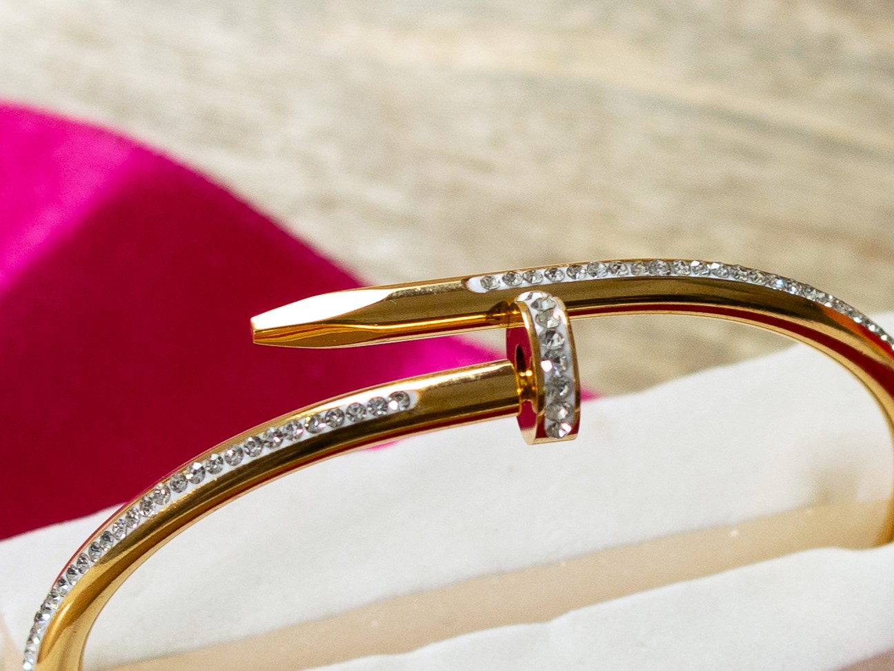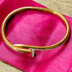 A unique and edgy bangle bracelet designed to resemble a nail. This piece features crystal accents along the nail head and part of the band, adding a touch of glamour to the industrial-inspired design.