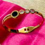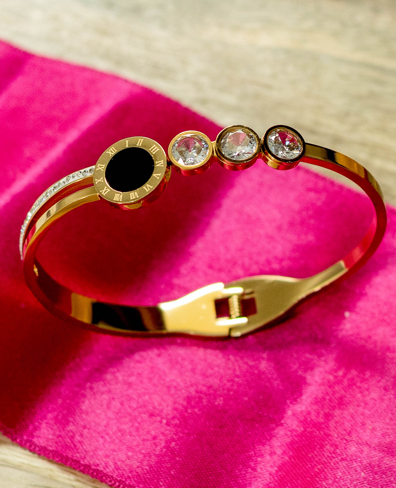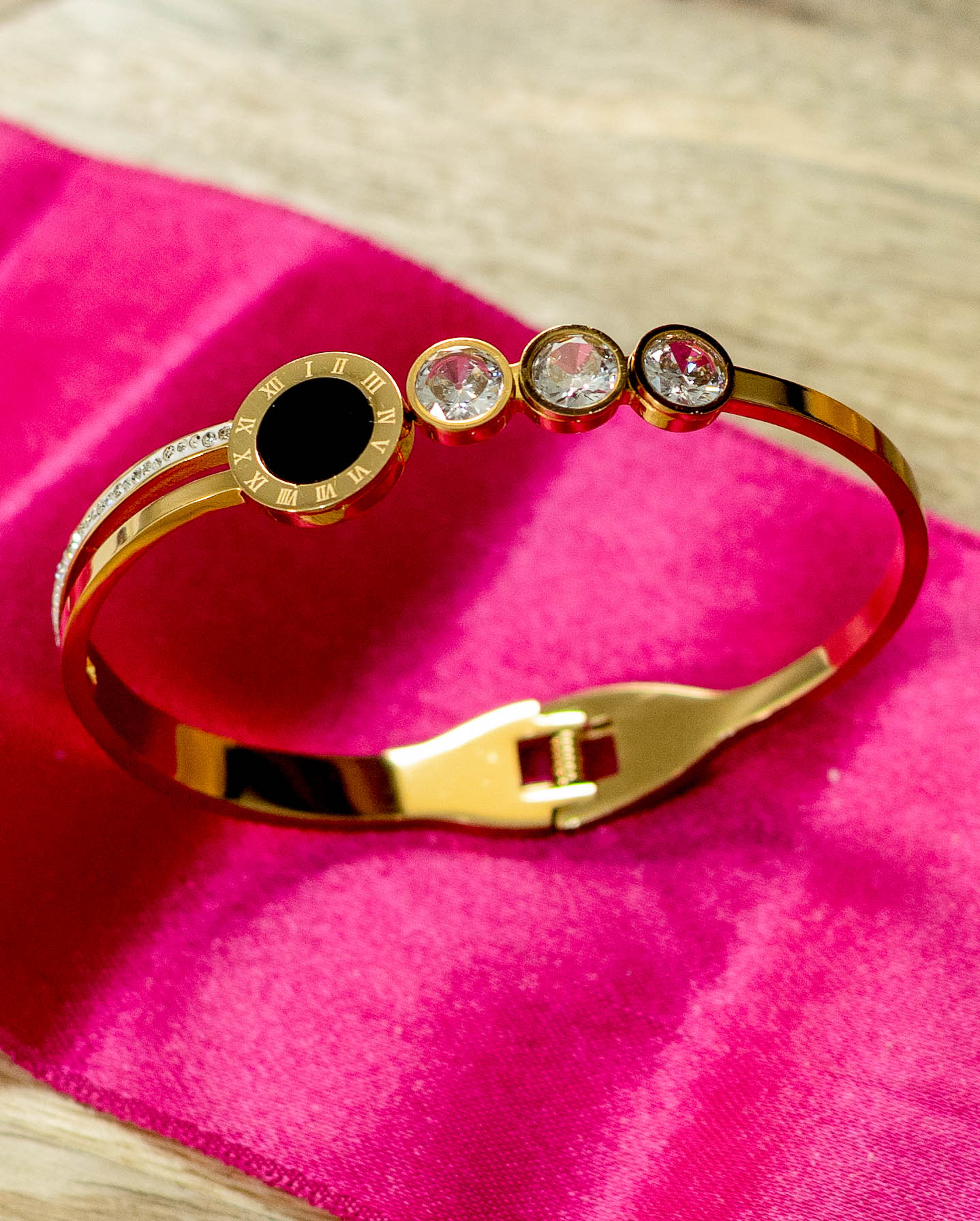 A chic bangle bracelet featuring a mix of design elements. It showcases a section with Roman numerals, interspersed with crystal-studded circles and larger clear crystals, creating a blend of classic and contemporary styles.
